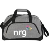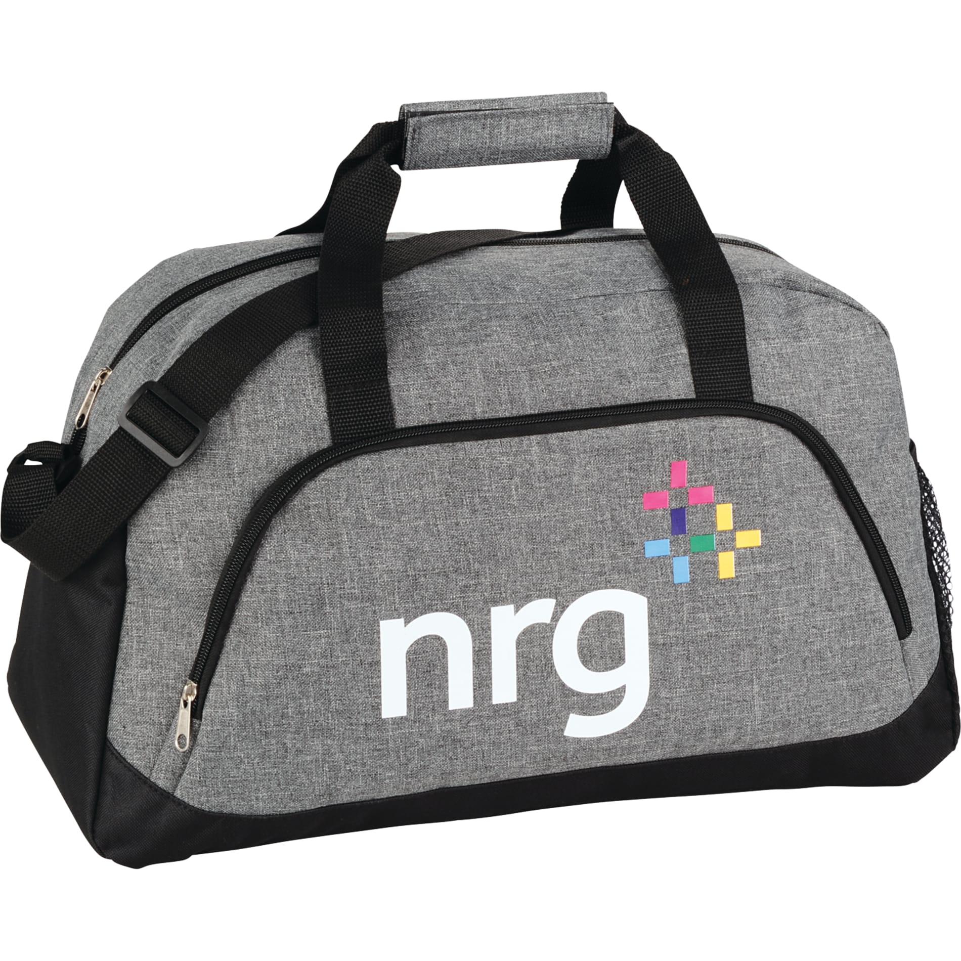 Stylish heathered graphite material. Large main opening. Side water bottle pocket. Large front pocket for decorating. Padded grab handle.
