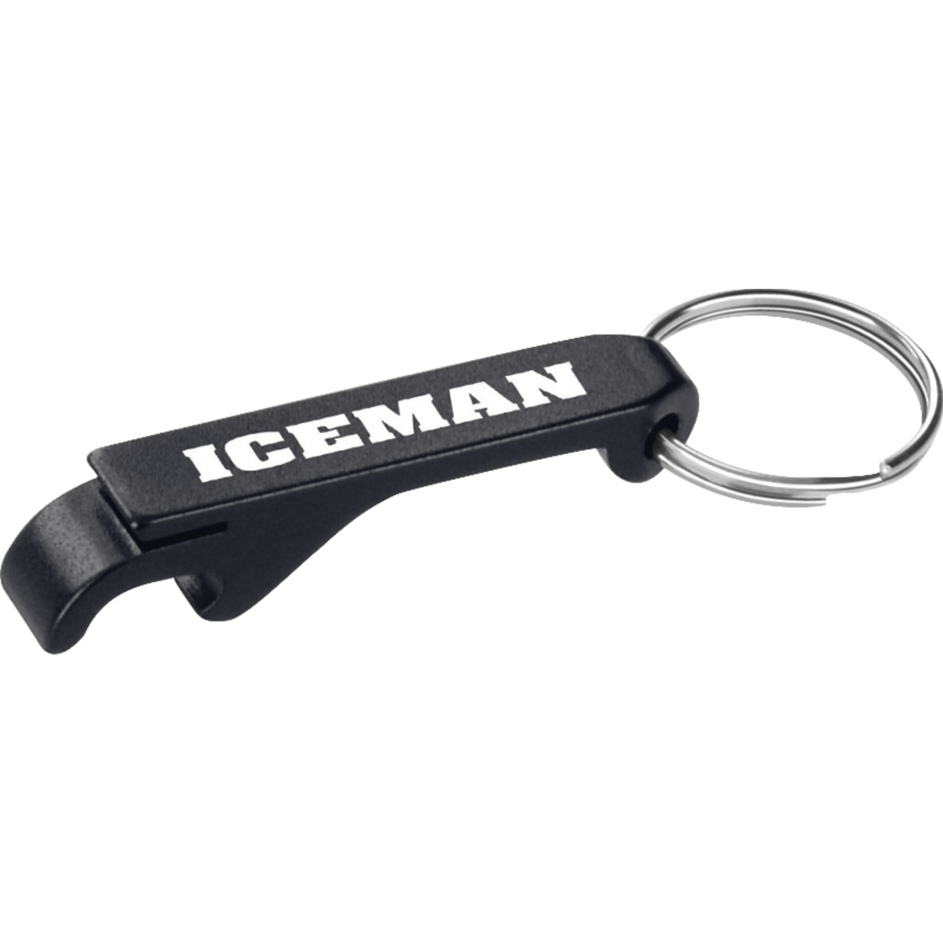 The Aluminum Bottle/Can Opener opens both bottles and flip-top cans and includes a metal split key ring.