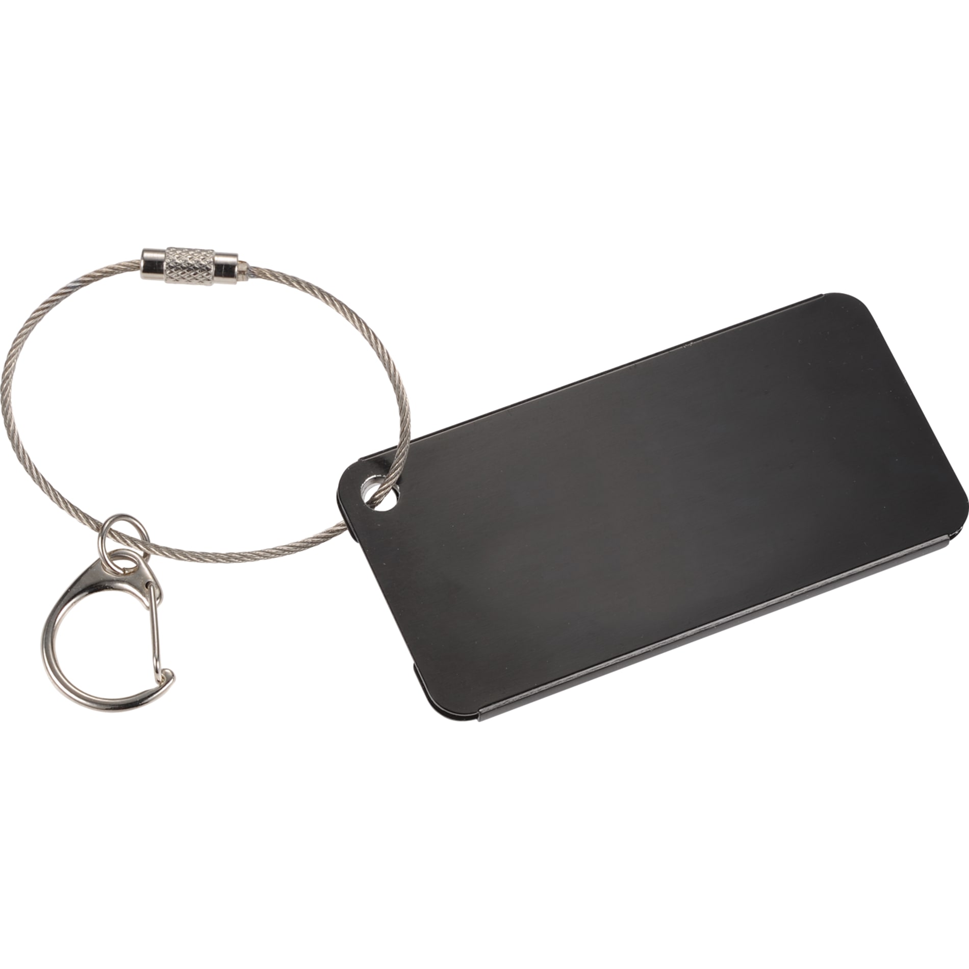Aluminum tag with metal wire twist action closure and secondary clip attachment option. Size: 3” X 1.5”.