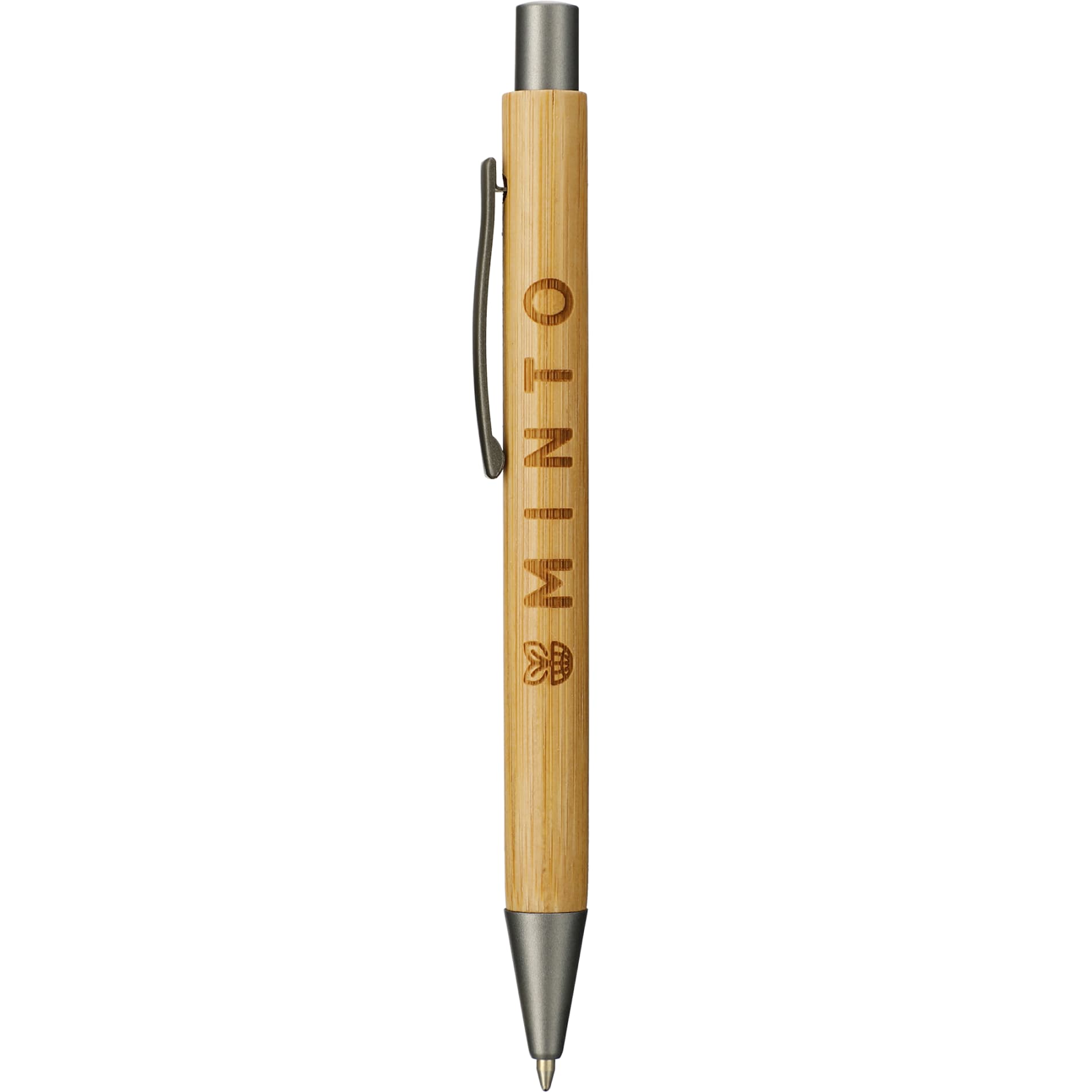 The Bamboo Ballpoint features a 100% bamboo barrel with gunmetal accents. Equipped with ultra-smooth, quick dry semi-gel black ink cartridge. Click action mechanism. Pen tip is 1 mm. Writing length is 800m. Laser finish is light to dark brown wood burned appearance.