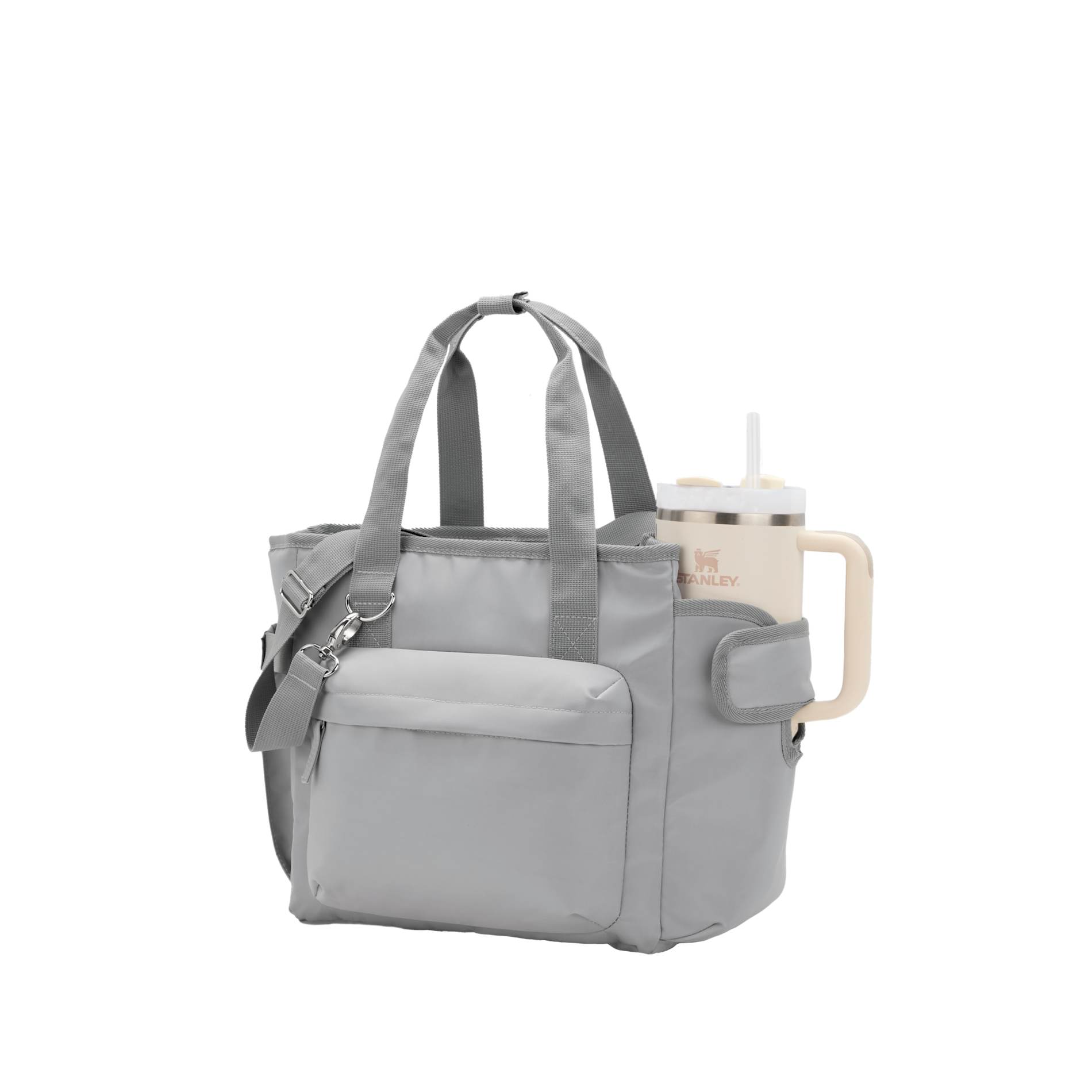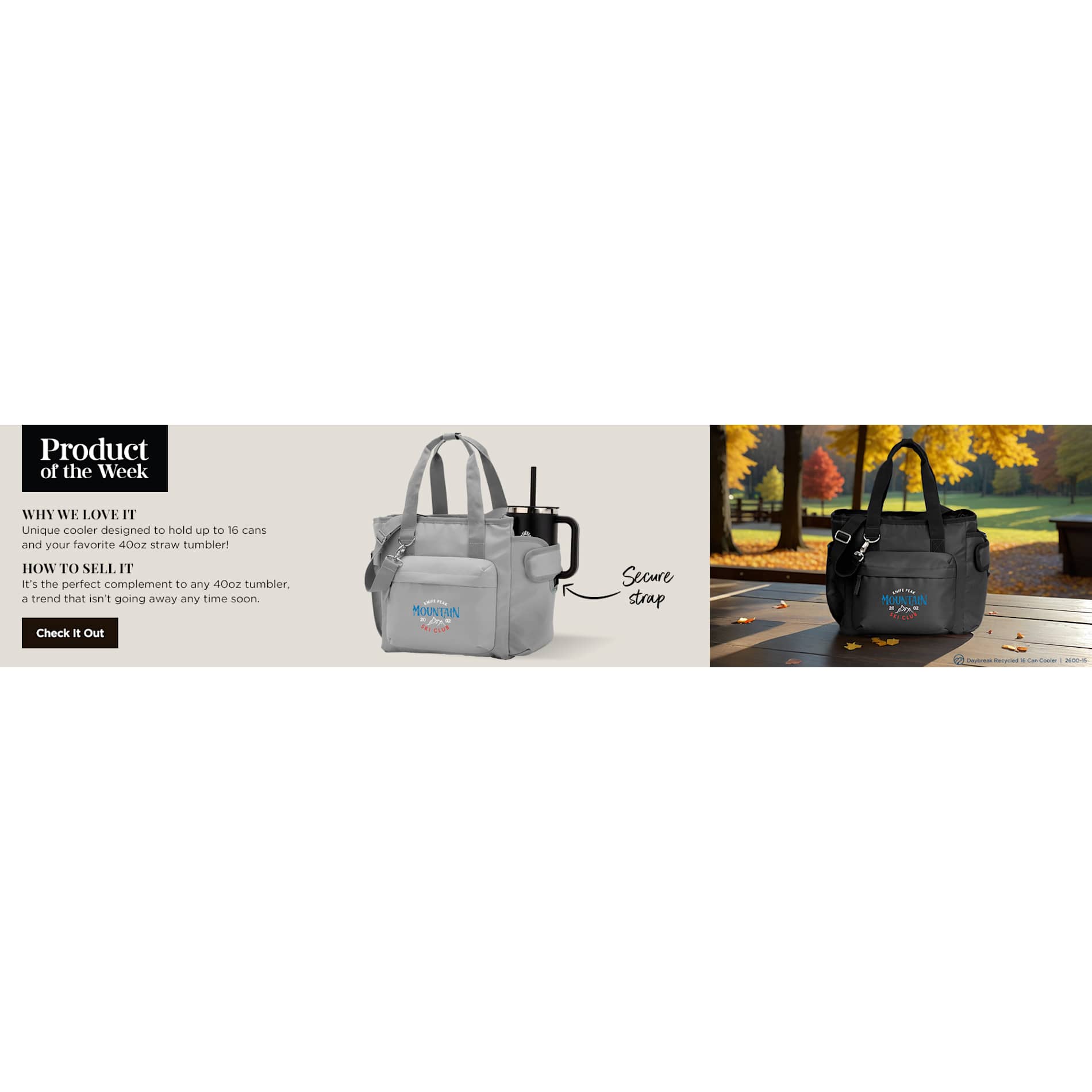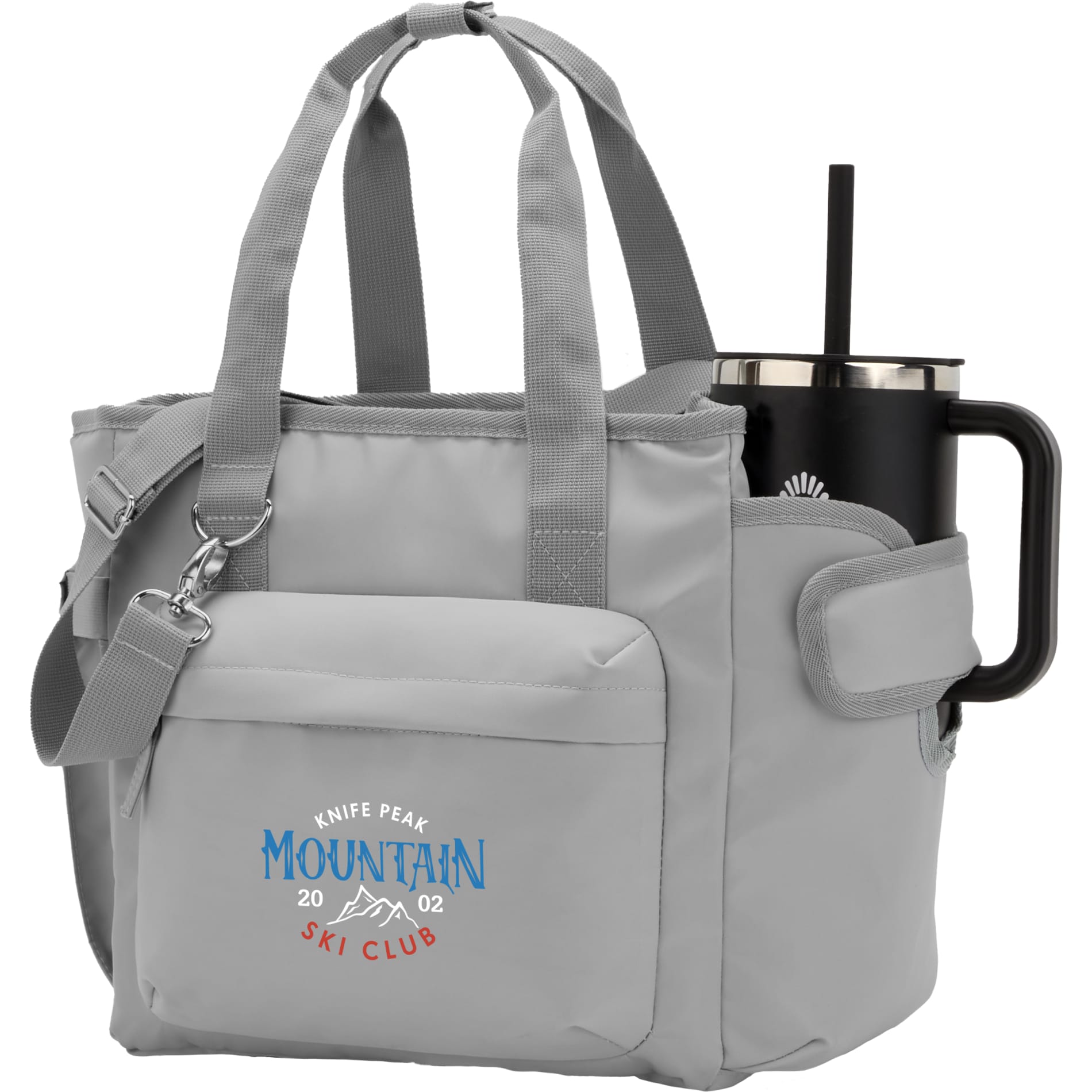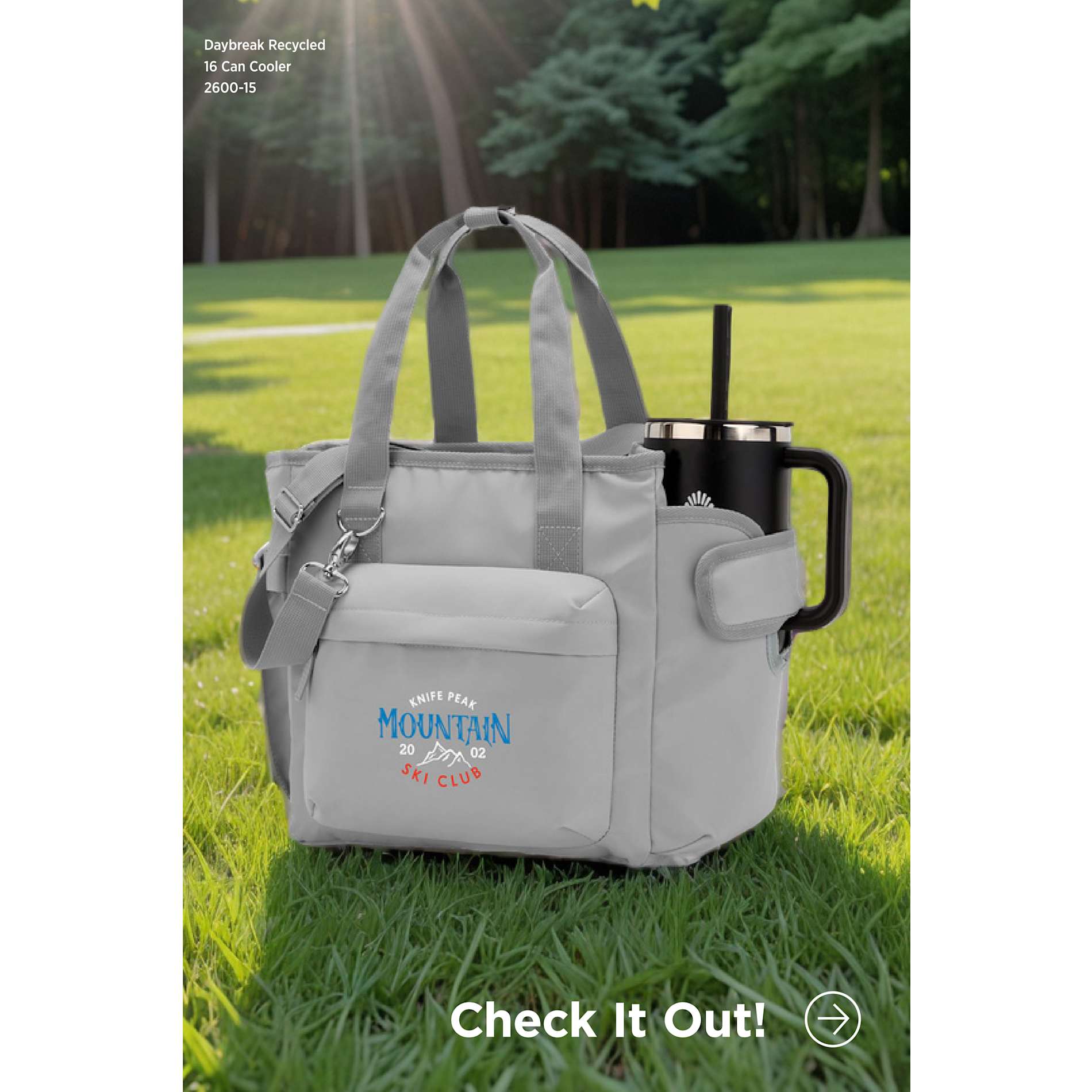 The Daybreak 16 Can Cooler features a unique exterior pocket designed to fit all drinkware, including 40oz travel tumblers with handles! Simply slide your favorite travel tumbler into the side pocket and secure it in place with the built-in hook-and-loop strap. The zip-top opening allows easy access to the items inside while the zippered front pocket provides additional storage. The adjustable crossbody strap is easily removed when not in use and the sturdy carry handles snap together for comfortable carrying.