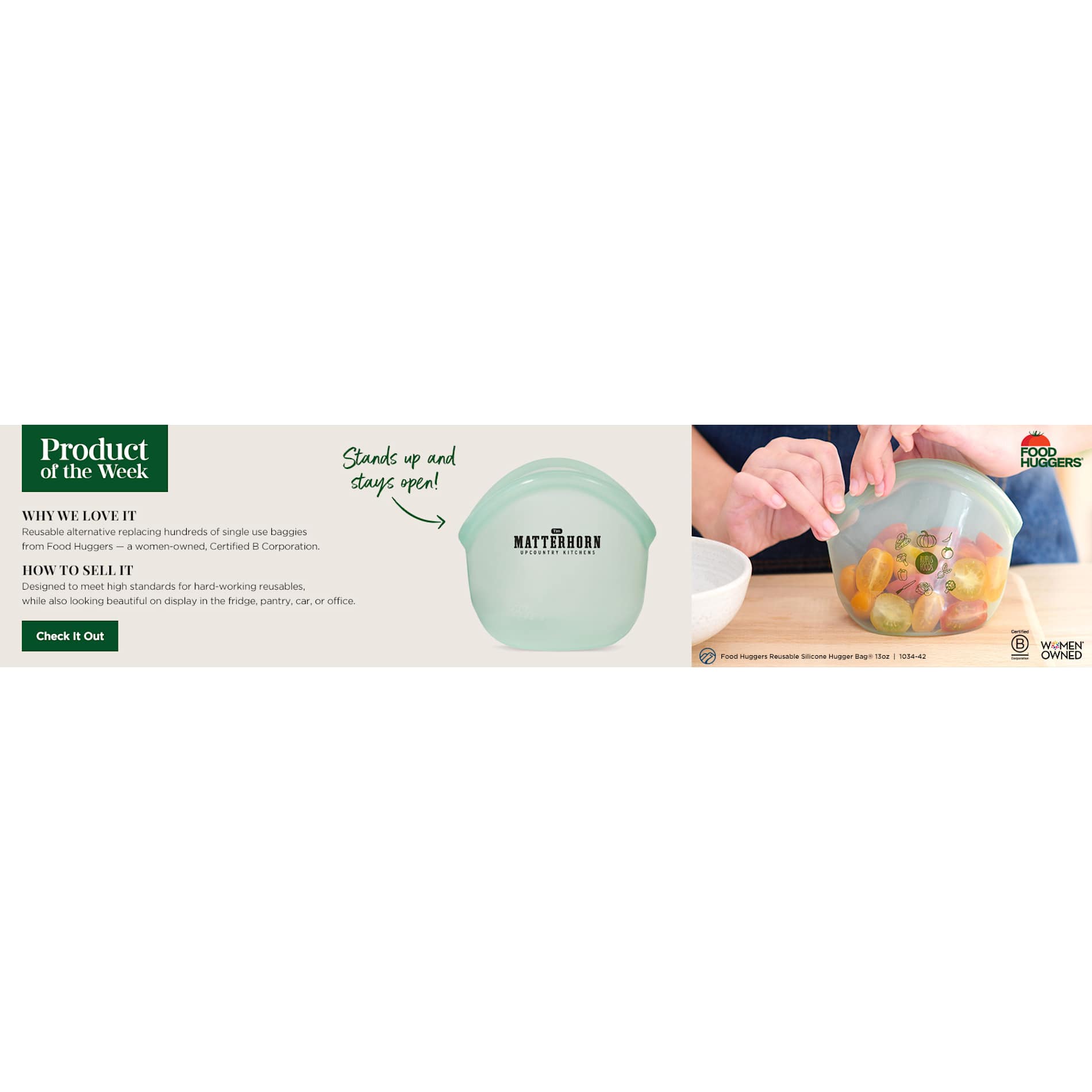 Welcome to the new generation of reusable bags. Hugger Bags are designed to meet high standards for hard-working reusables, while also looking beautiful on display in your fridge, pantry, car, office or wherever you decide to take them! Hugger Bags are infinitely reusable and easy to clean. Designed with broad corners so nothing collects there and air circulates so they dry easily. Hugger Bags are the only reusable silicone bags that stand up, stay open and also fold flat for compact storage. Handwash Only. 13oz capacity.