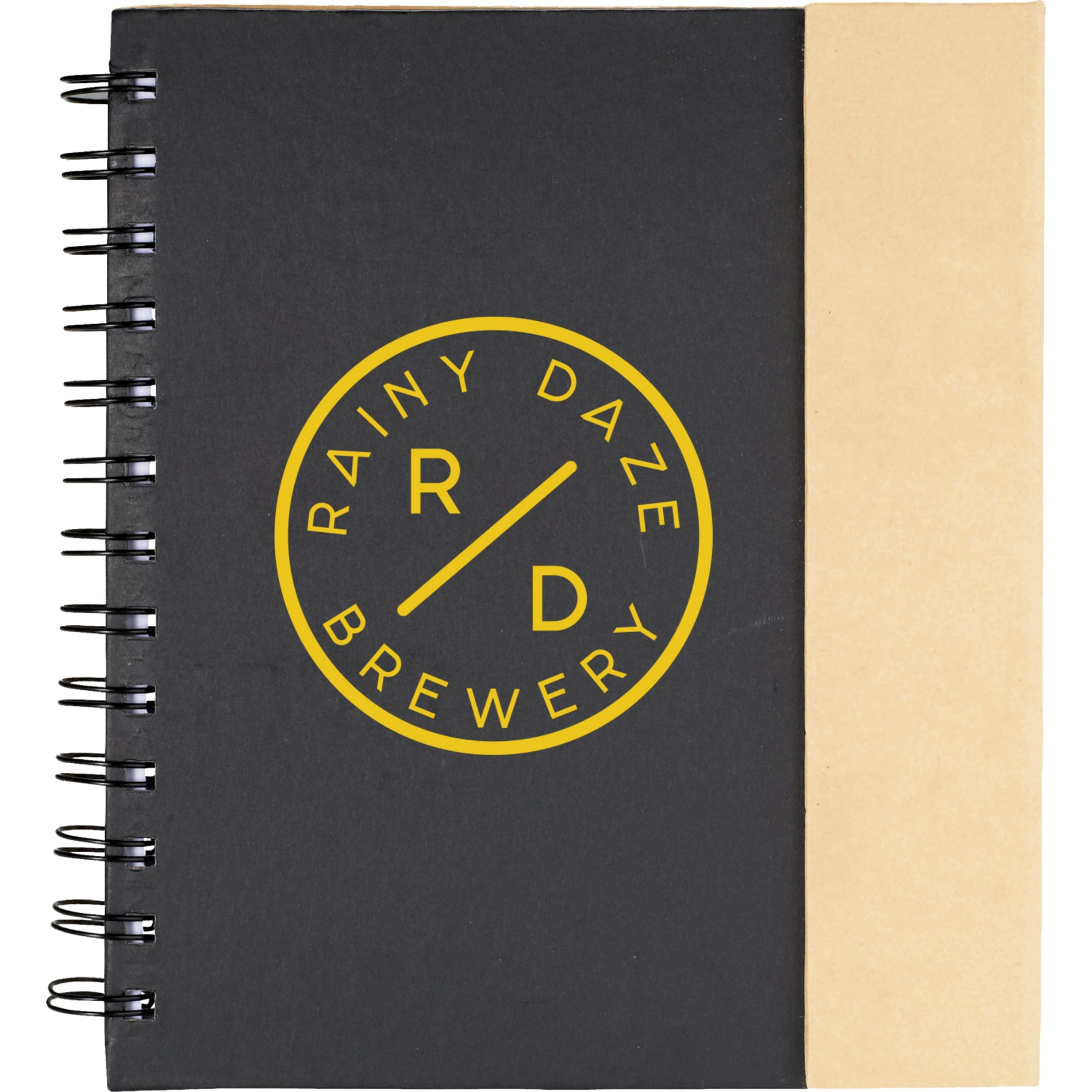 The Bullet 6.5" x 7" FSC® Mix Lock-it Spiral Notebook features 70 ruled pages of FSC® Mix paper and a magnetic closure. It also includes 25 sheets of 4" x 3" sticky memo pads and 25 sheets of 3" x 2" sticky memo pads in 5 assorted colors. The Lock-it Spiral Notebook also comes with a recycled cardboard ballpoint pen. Note that a pen imprint is not available and pens are packed separately.