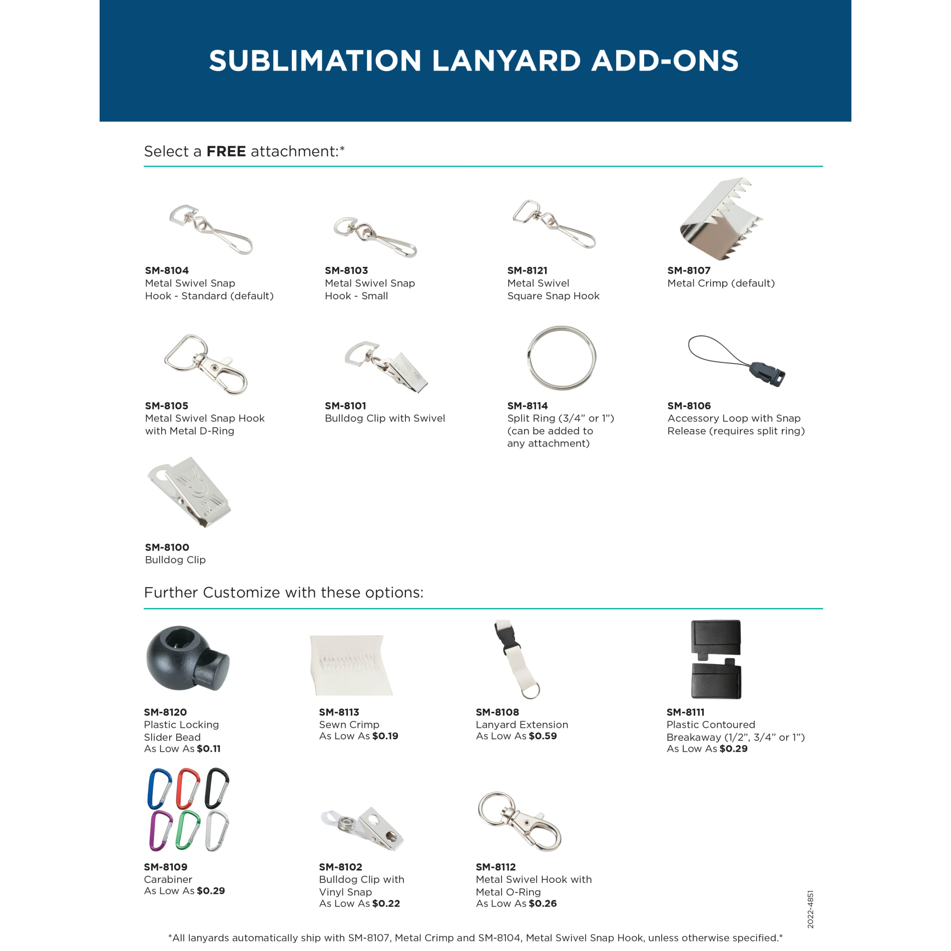The Full Color 1"Lanyard w/Hook is a full sublimation-dyed traditional lanyard with textured look that's Made in the USA in a 1 inch width, 36-inch length. Lanyard comes with a metal crimp and metal swivel snap hook (SM-8104) as default attachment. Alternate attachment options available. Must specify optional attachment item number at time of order. Packed in standard bundles of 50. FOB ZIP: RI, 02920