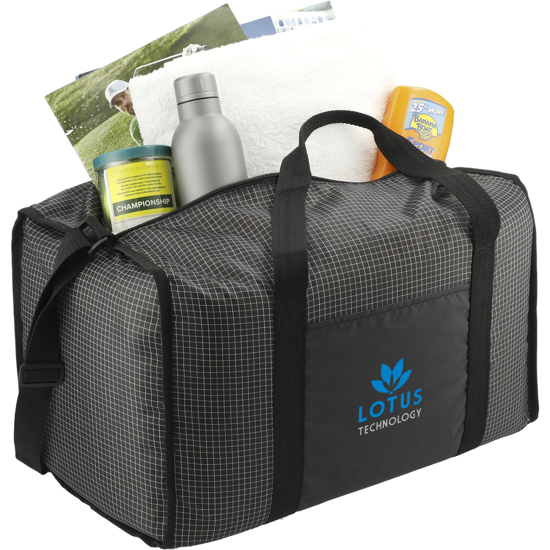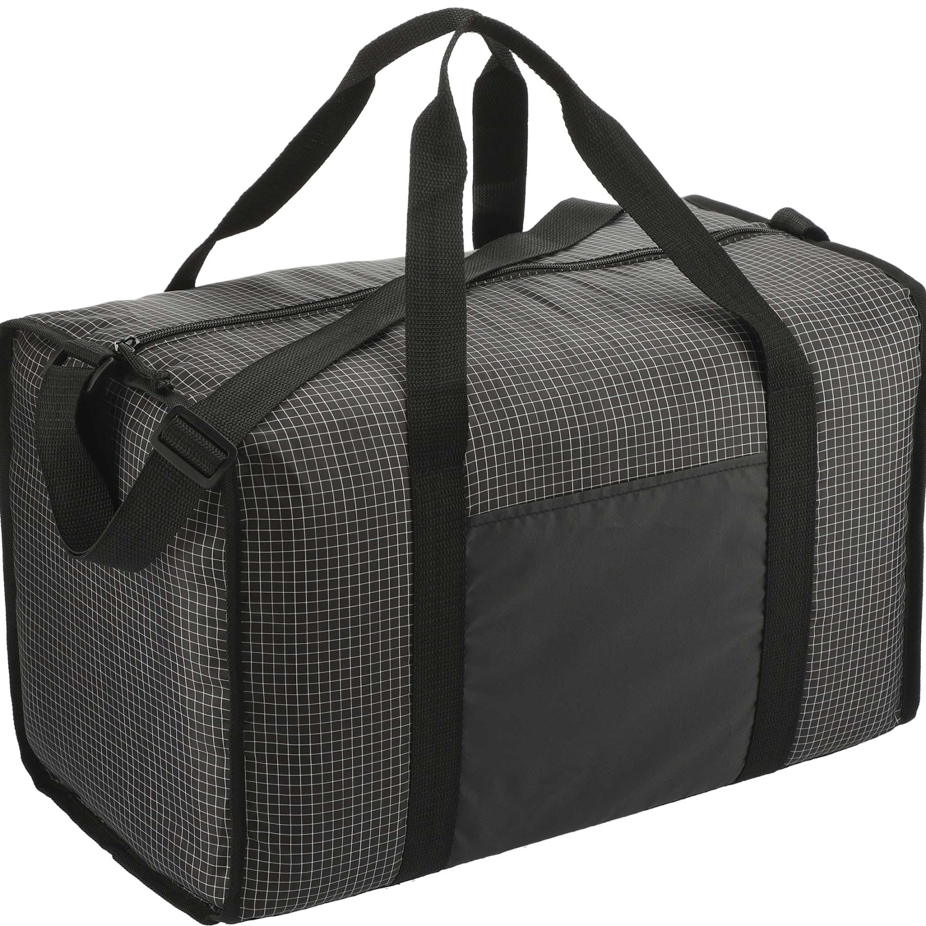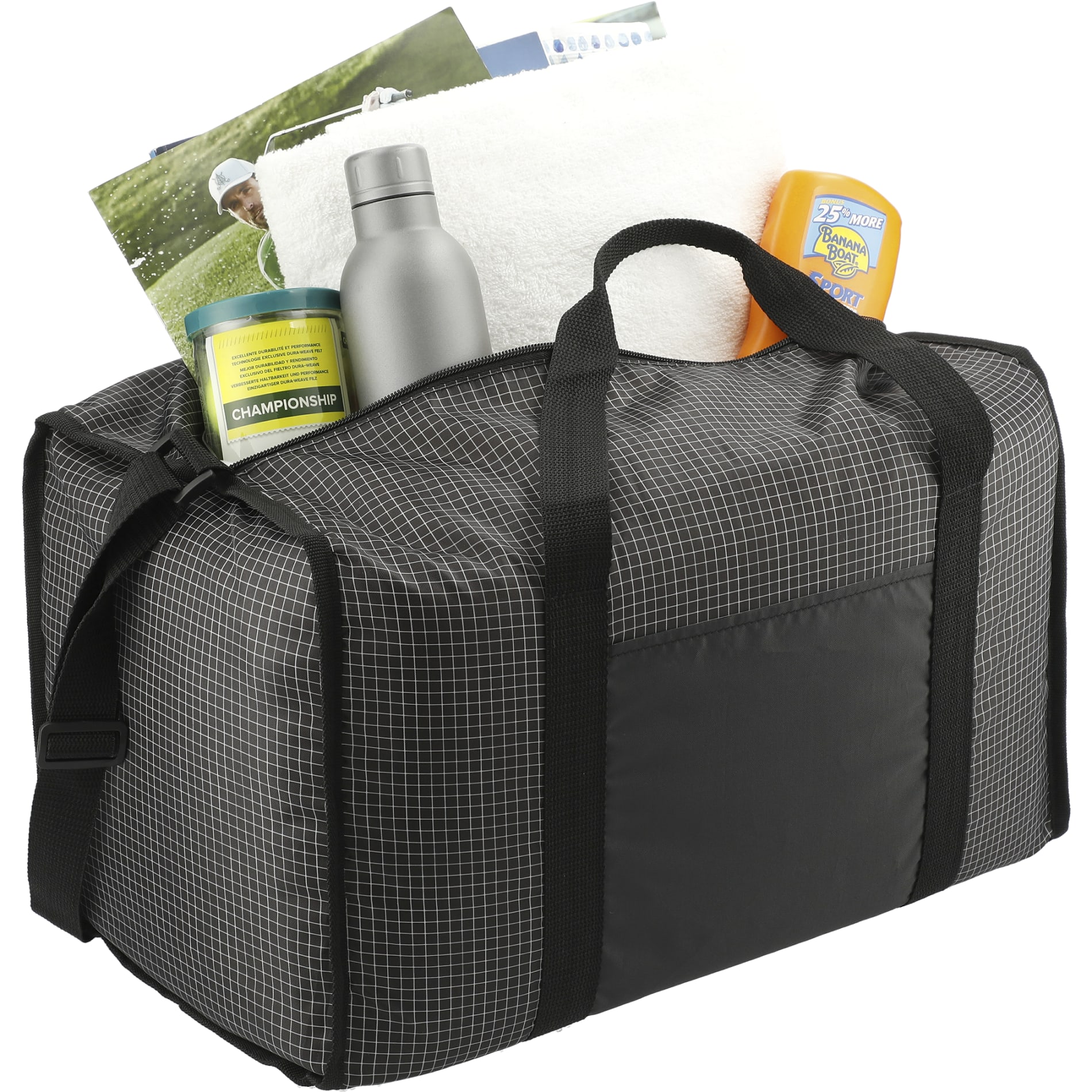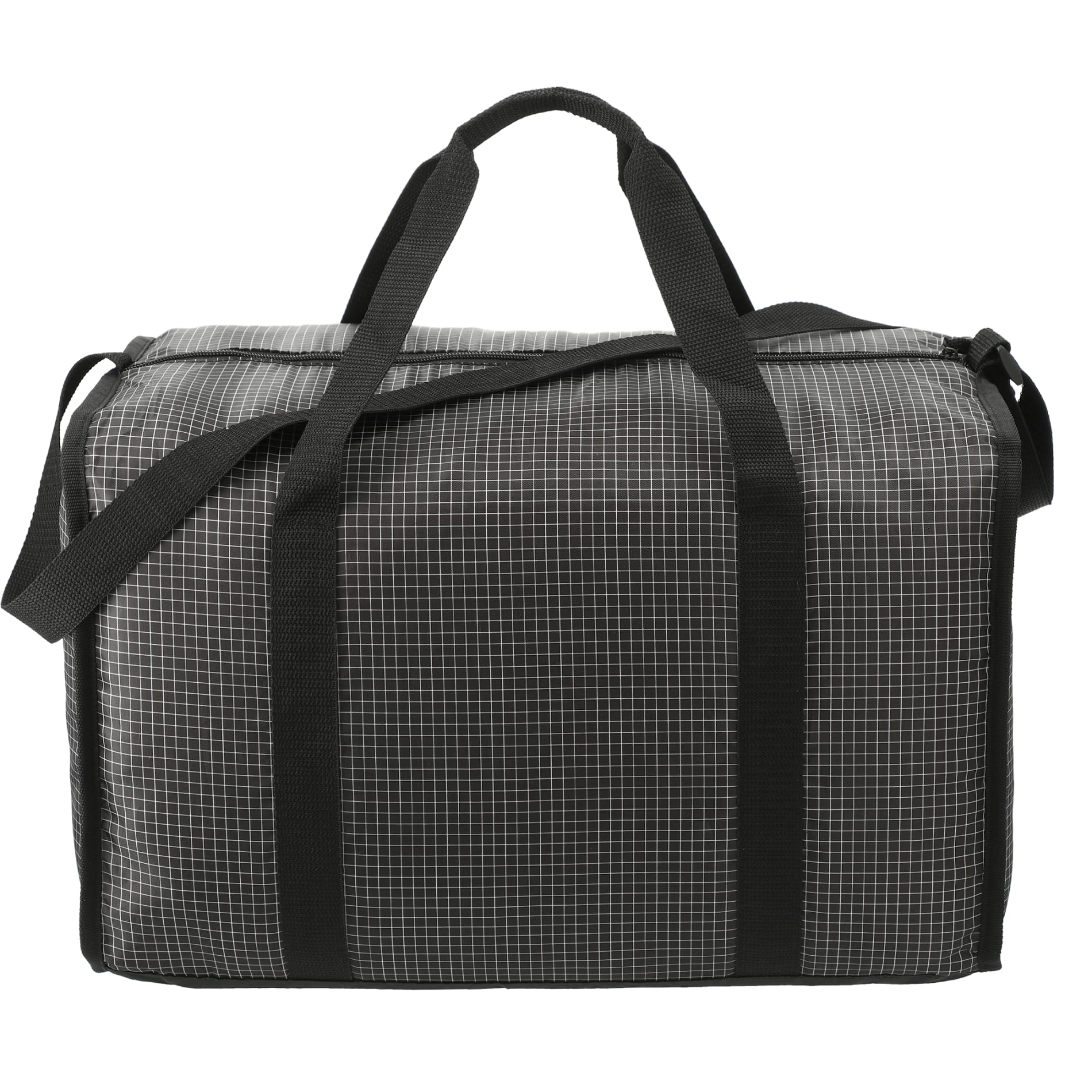 The Grid Boxy Duffel features a roomy zippered main compartment, two carry handles, and an adjustable shoulder strap.