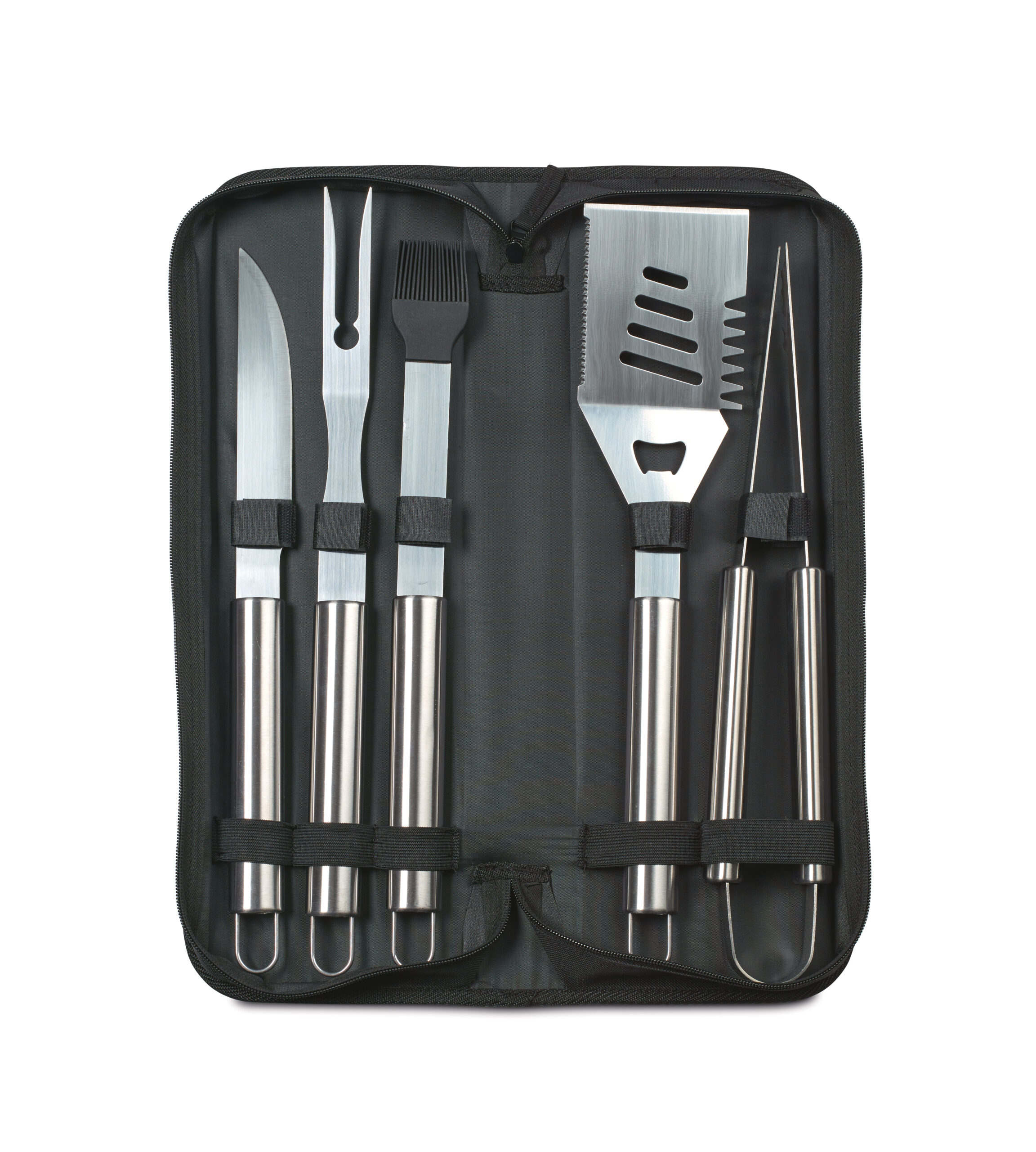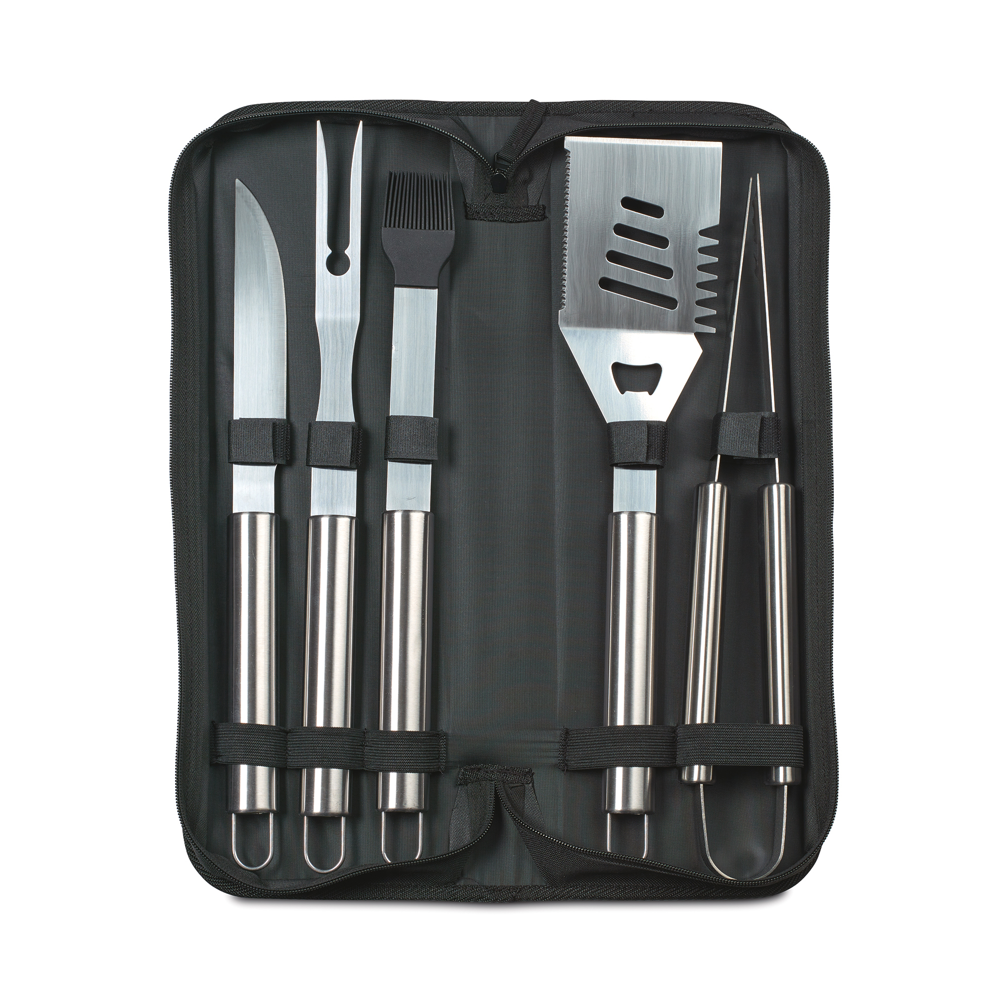 Grill like a pro with the Grill Master BBQ Tool Set. This 5-piece stainless steel kit includes all the essentials in a travel-ready case—complete with secure-grip handles, hanging loops, and a sleek silicone brush. Designed for comfort, ease, and serious barbecue.