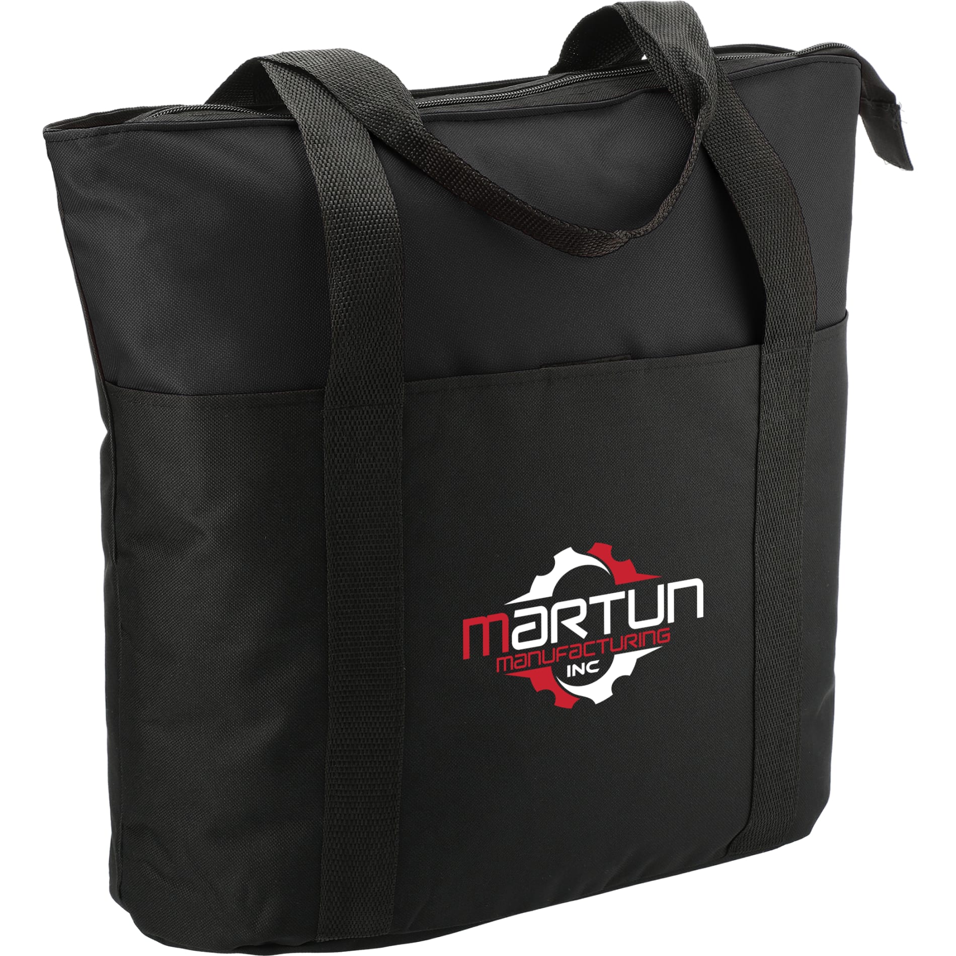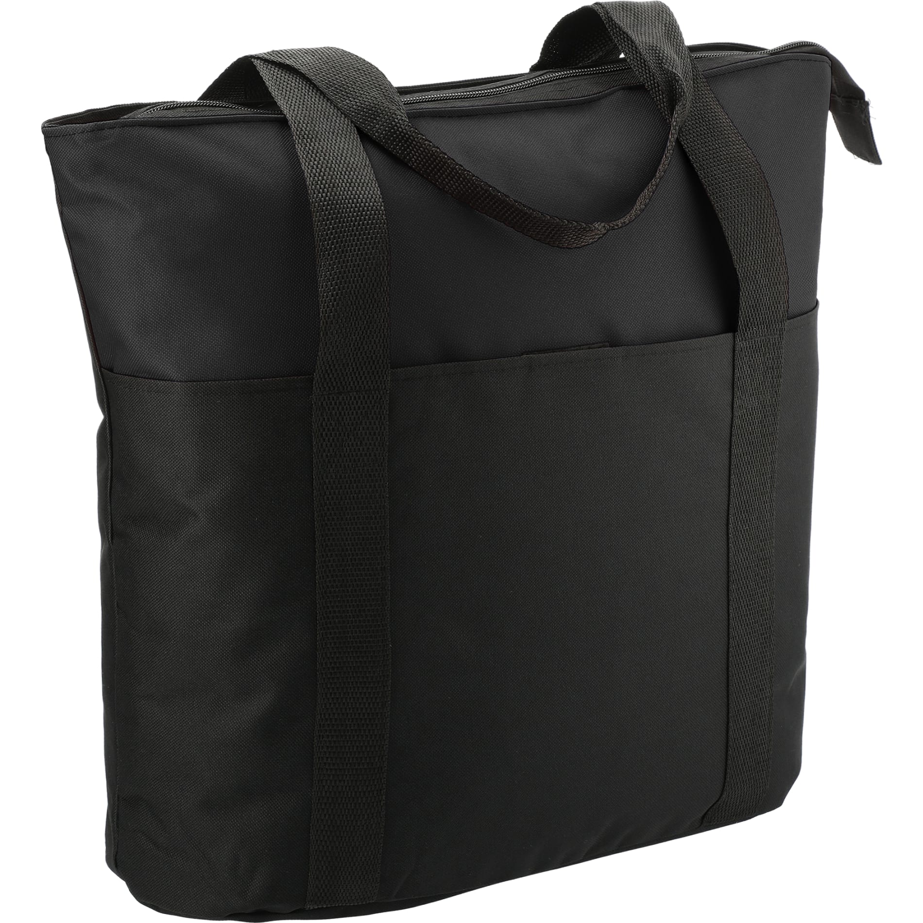 The Heavy Duty Zippered Convention Tote has a zippered main compartment and an interior zippered pocket. It also features a front pocket with a hook and loop closure and double 29 inch handles. Great for conventions, tradeshows and meetings around town.