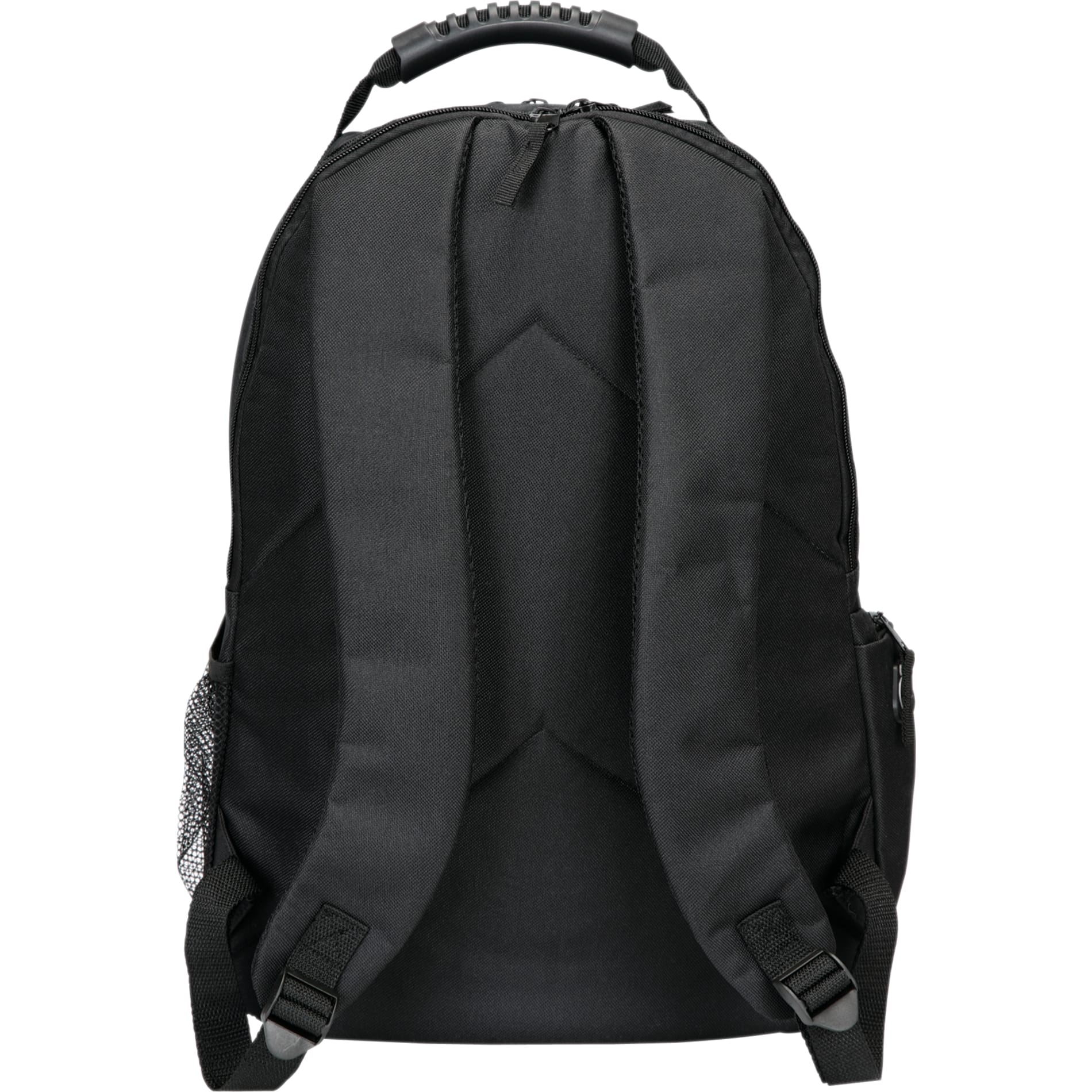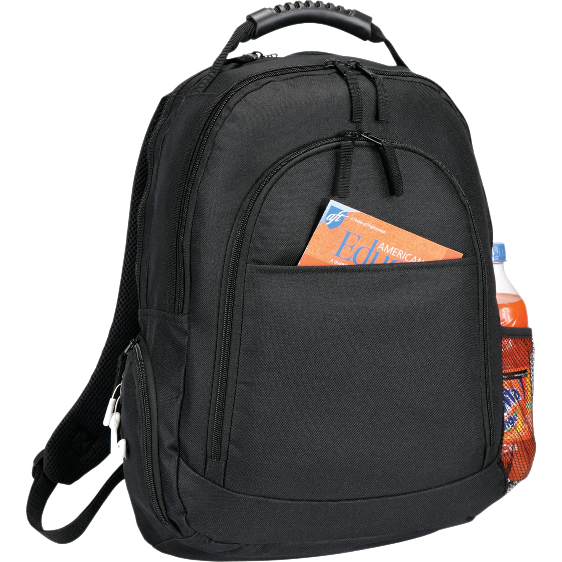 The Journey 15" Computer Backpack includes two zippered main compartments and a back compartment containing a padded laptop compartment with a hook and loop secured strap. The zippered front pocket includes a deluxe organization panel with multiple pockets, plus a side mesh pocket and media pocket with an earbud port. A reinforced heavy-duty rubber-trimmed top carry handle also make it easy to carry..