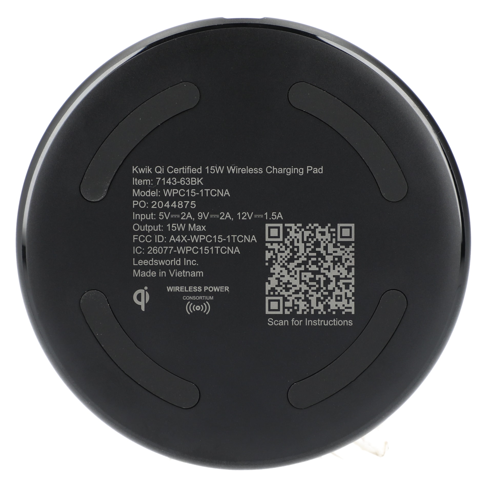 The Kwik Qi Certified 15W Wireless Charging Pad delivers up to 15W of wireless power to Android devices and up to 7.5W for All iPhone 8/X/11/12/13/14/15 Series. It works with most plastic phone cases on and includes 39-inch Type-C to Type-C cable. It is recommended to use UL or ETL Listed 20W USB-C power adapter. Qi certified.