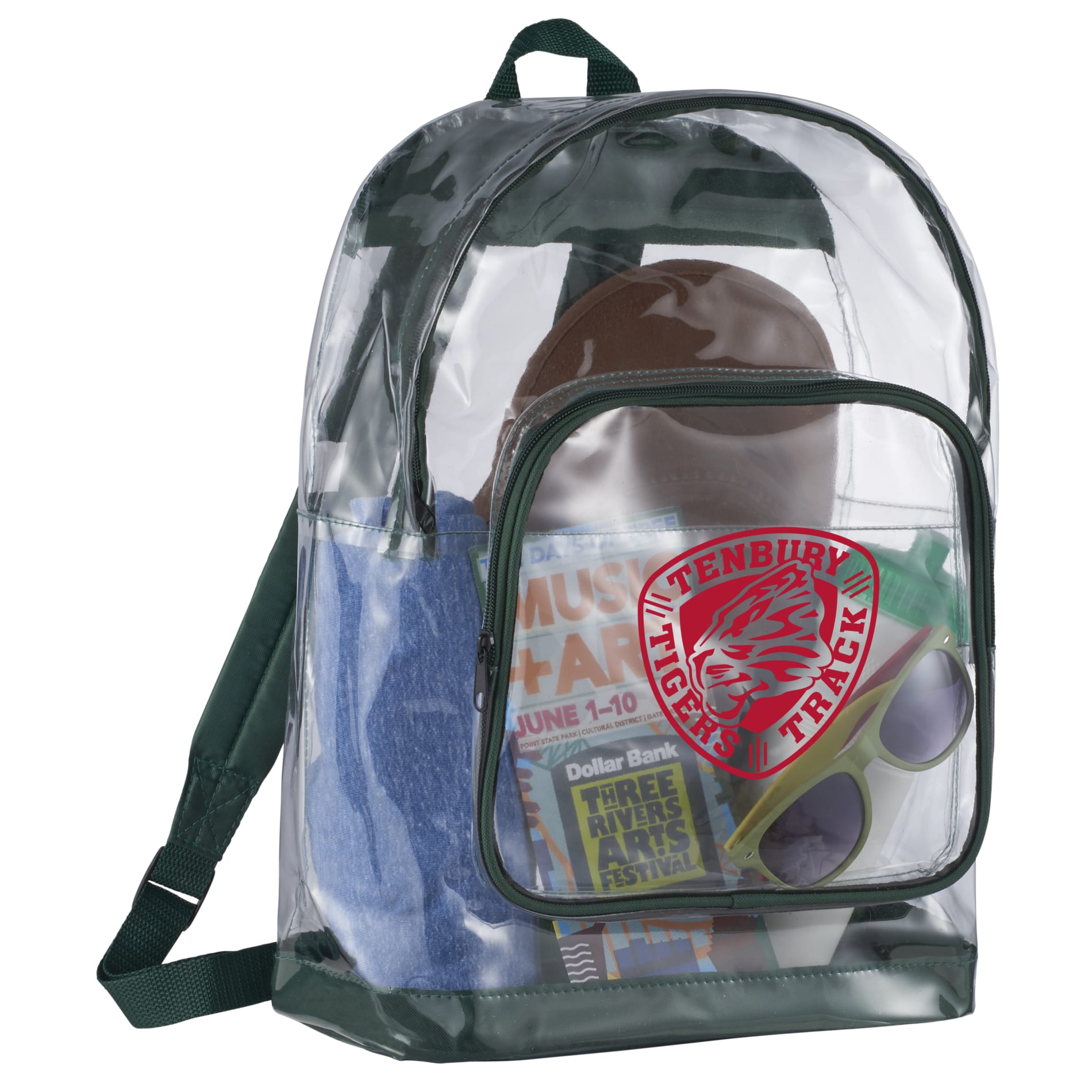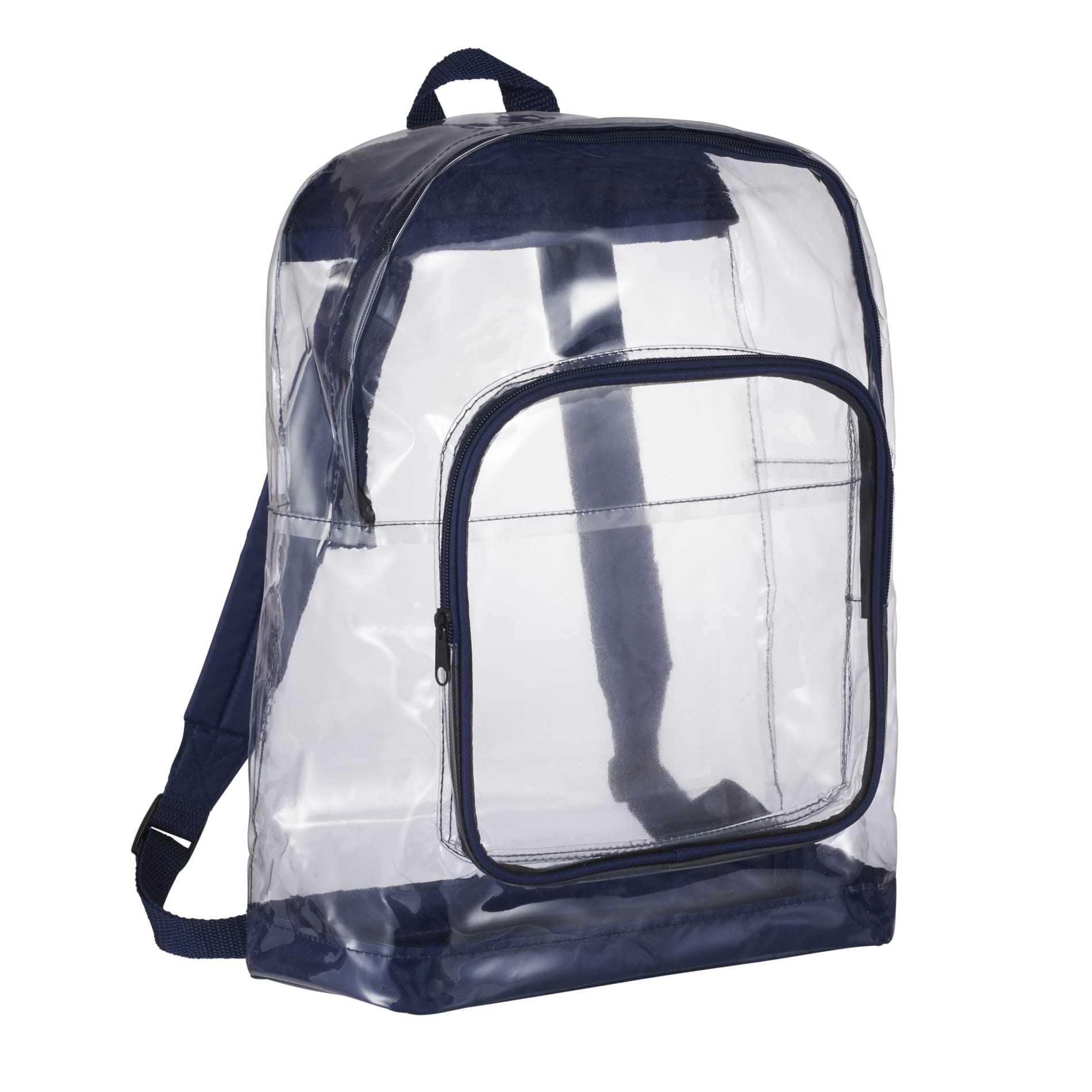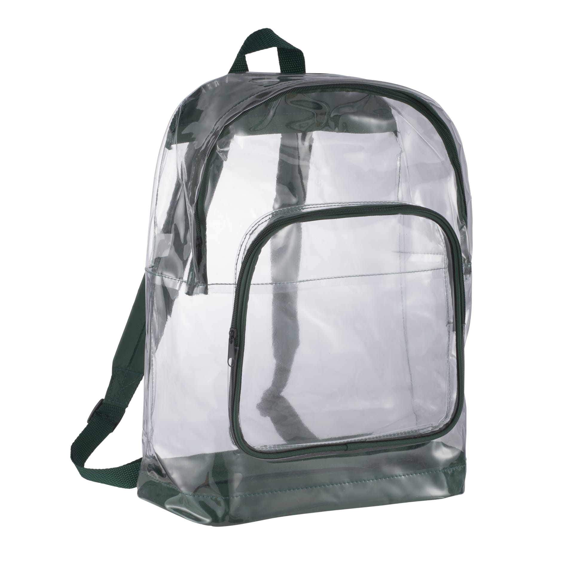 The Rally Clear Backpack has transparent material that makes this bag perfect for stadium, event, workplace and other safety purposes. The large zippered main compartment features a reinforced 210d bottom and a large gusseted zippered front pocket with a protective flap. Adjustable padded shoulder straps and a top carry handle make carrying convenient.