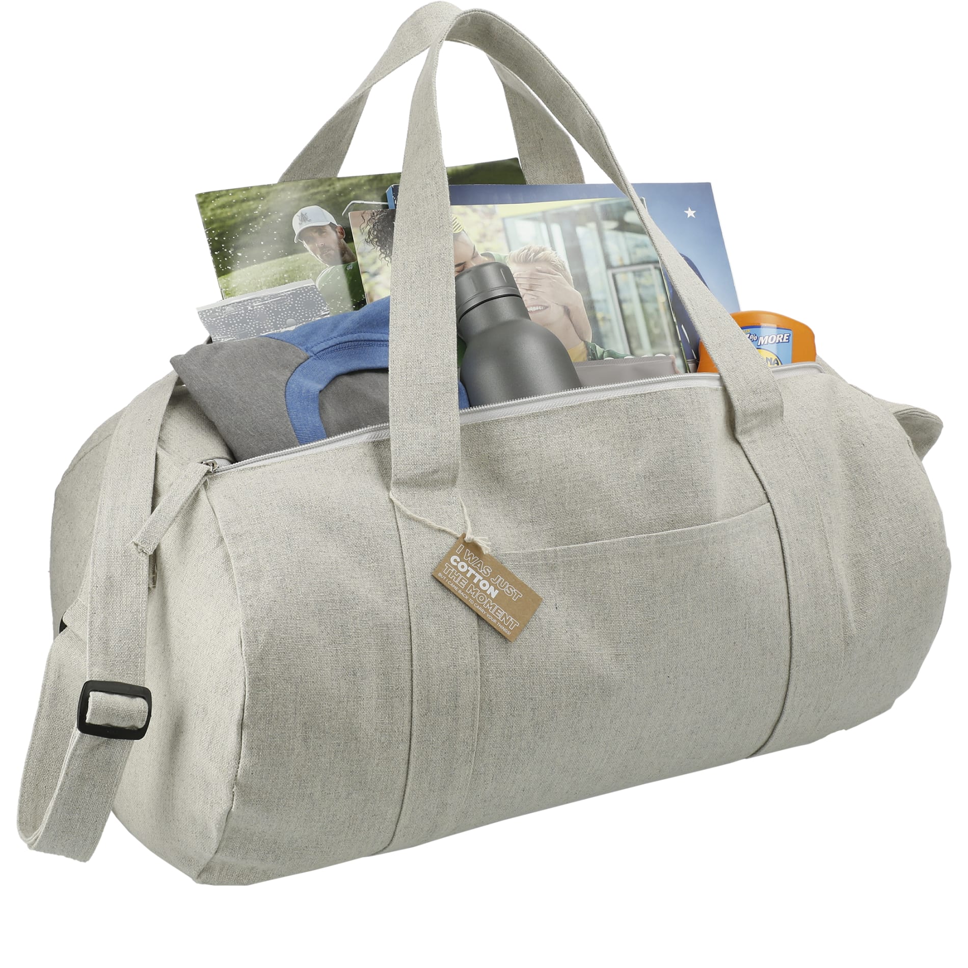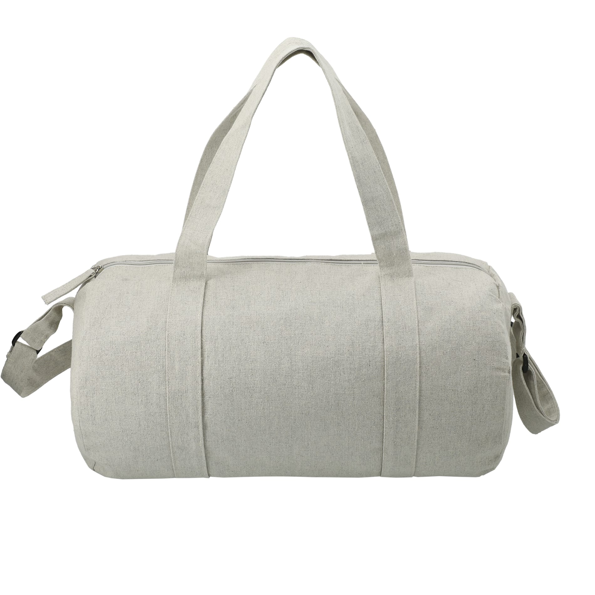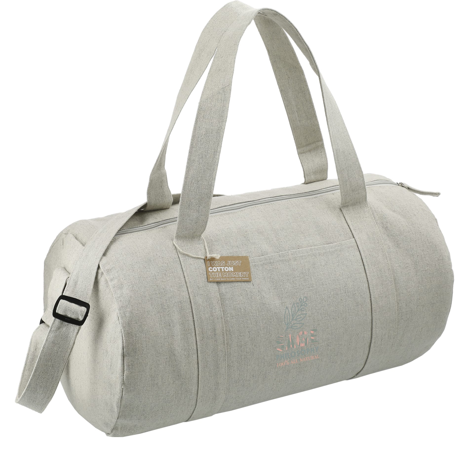 The Repose 10oz Recycled Cotton Barrel Duffel features a roomy zippered main compartment, a front slash pocket, and double grab handles.Through a partnership with 1% For The Planet, one percent of sales of all EcoSmart® products are donated to environmental nonprofits.