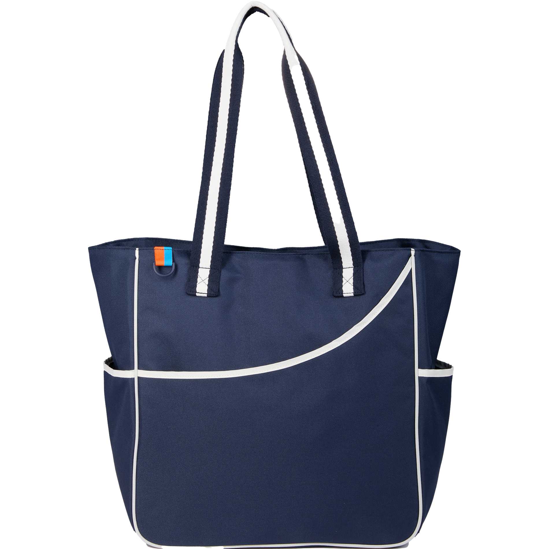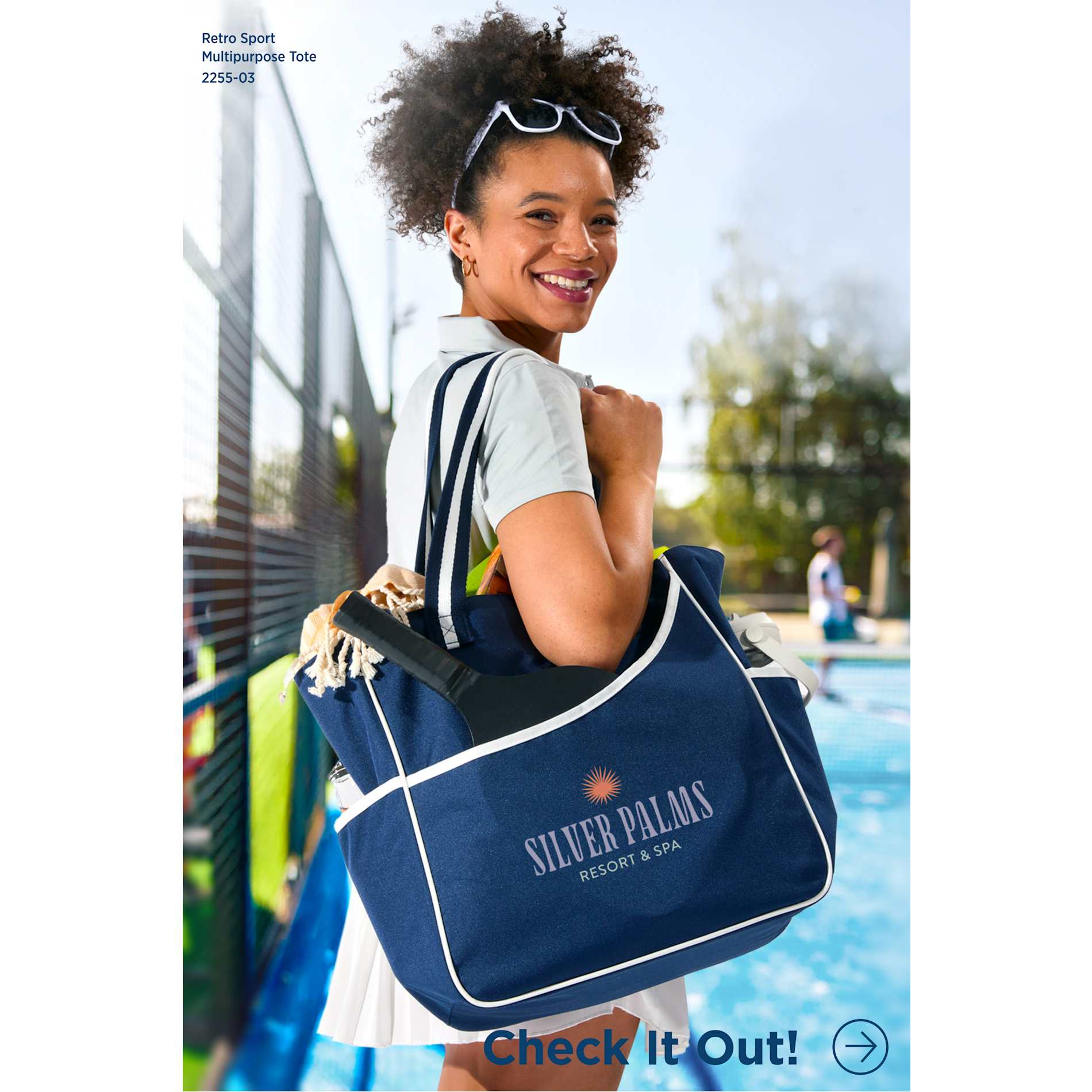 The Retro Sport Multipurpose Tote combines on-trend style with versatile functionality, making it the perfect over-the-shoulder bag for both sports and everyday use. This tote features a unique curved front pocket designed to securely hold your pickleball paddles or other essentials, while the snap-close main compartment and two side hydration pockets keep your belongings organized and accessible. Accented with striped cotton webbing and a D-ring for added convenience, this bag offers both style and practicality. Made from rPET material. One percent of sales of this tote supports environmental nonprofits through a partnership with 1% For The Planet.