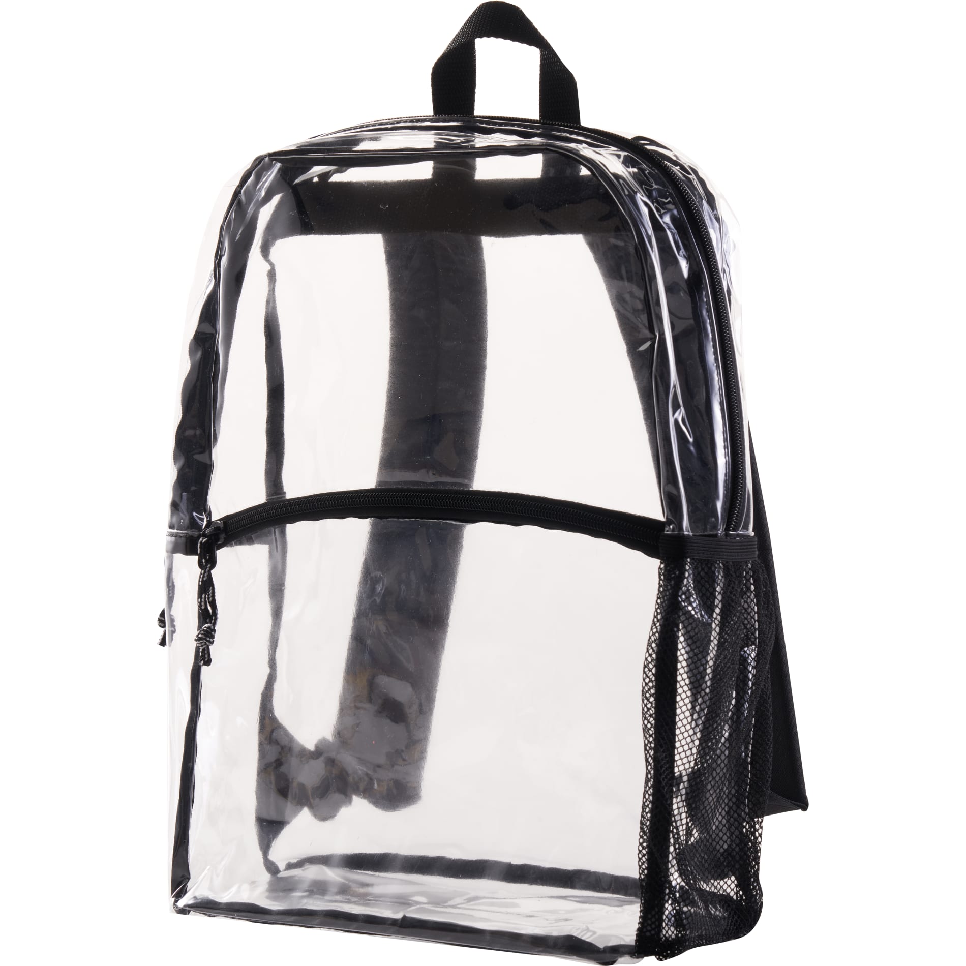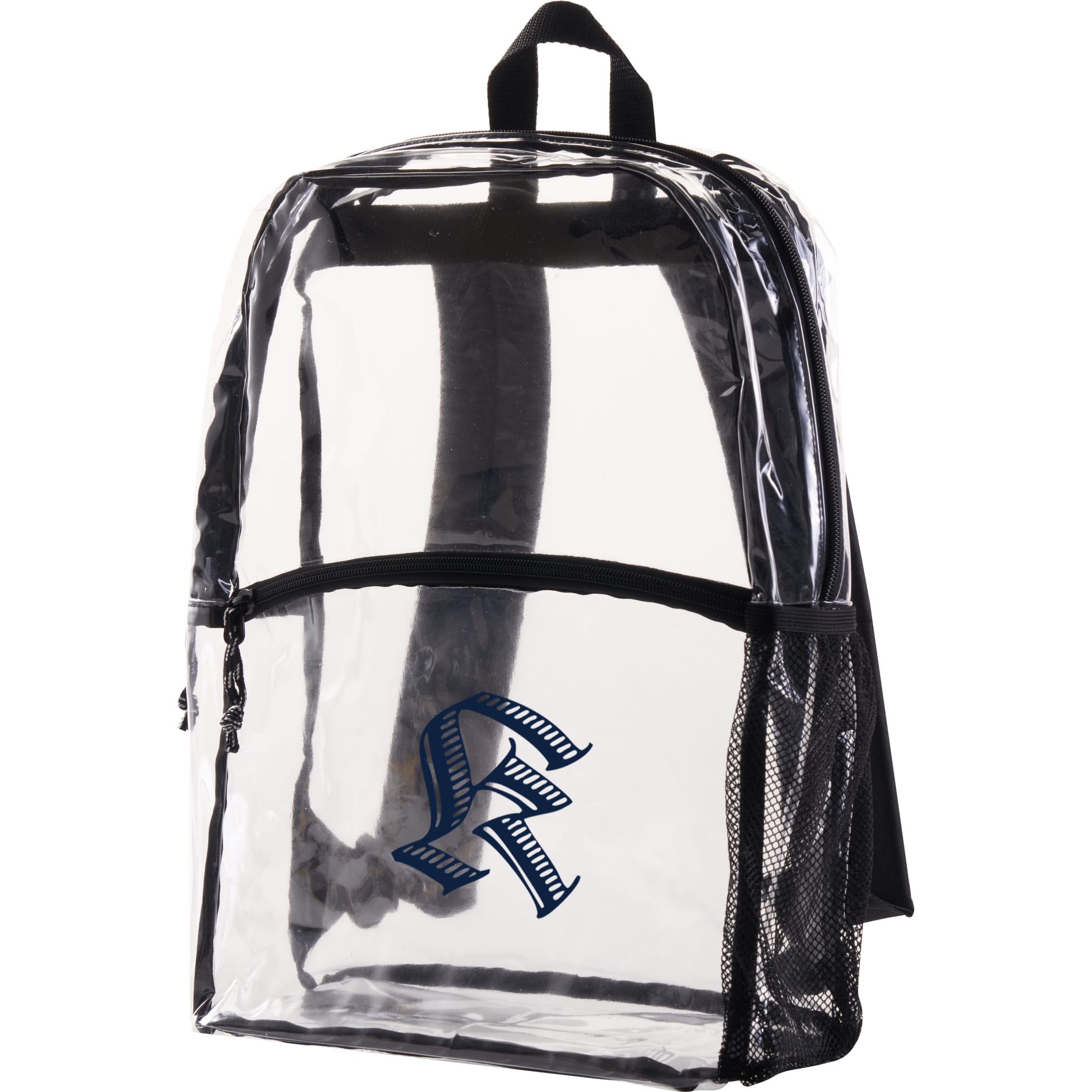 Clear PVC backpack with front pocket and side mesh water bottle pocket.