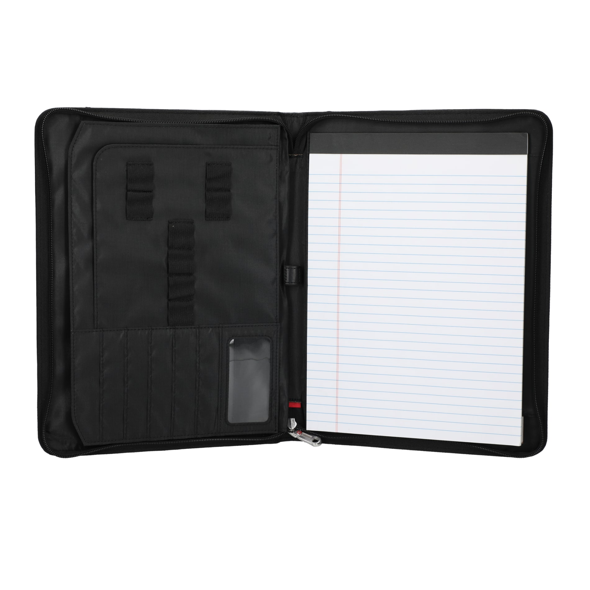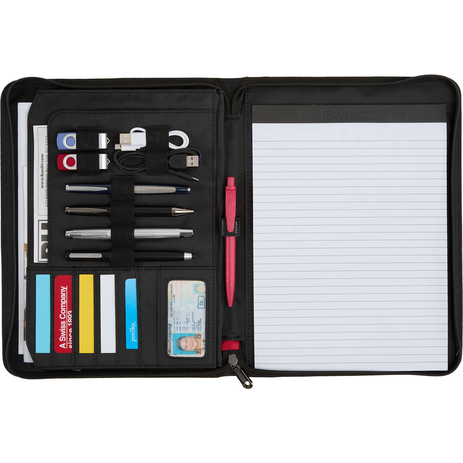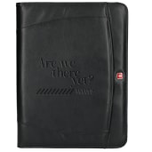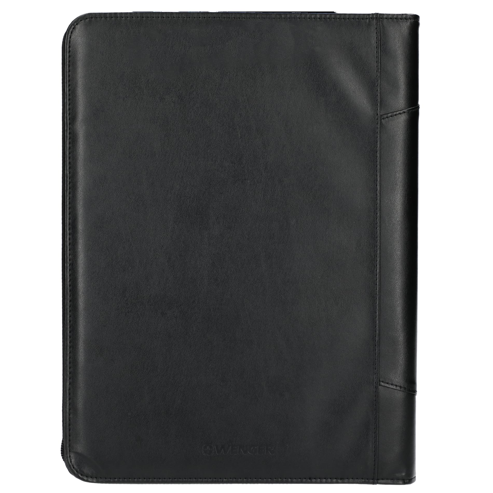 The Wenger Recycled Zippered Padfolio features a recycled PU cover material and 30 pages of recycled white lined paper. Interior includes gusset pocket, business card pockets elastic loops and pen loop. Includes white recycled gift box.